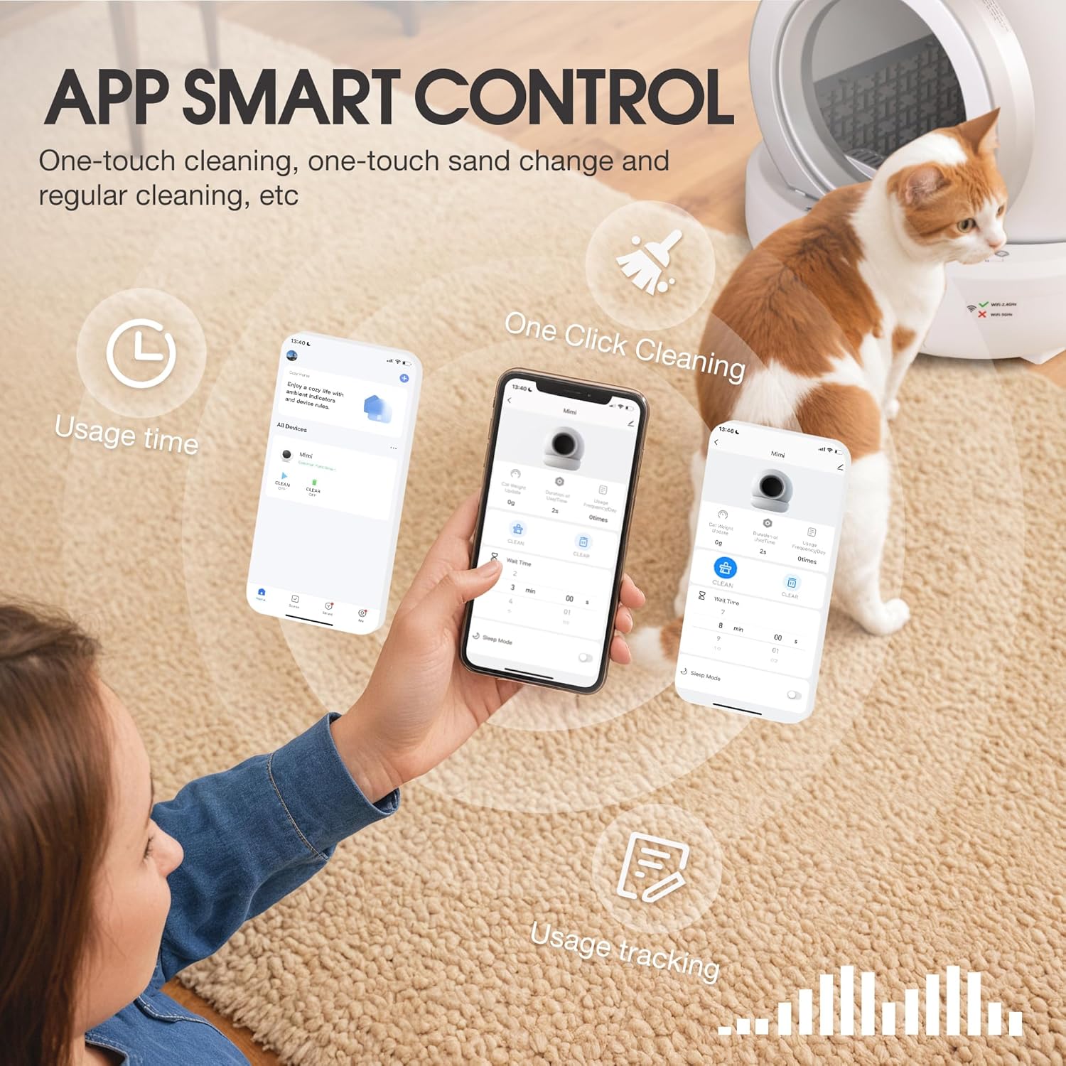 - APP INTELLIGENT CONTROL: Our self-cleaning cat litter box must be connected with 2.4GHz Wi-Fi and Bluetooth using APP to realize the functions of one-click cleaning, one-click litter change, timed cleaning, etc., which brings you an easy and convenient experience to say goodbye to the trouble of frequent cleaning.